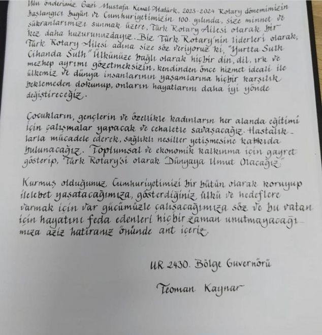 Bolu Rotary Kulübü 2023/24 Dönem Başkanı Halil İbrahim Yılmaz yaptığı açıklamada; ‘’Türk Rotaryenleri olarak yeni döneme Atamızı ziyaret ederek ‘’Merhaba’’ dedik. Türk Rotaryenleri olarak mevcut üç bölgemizin Federasyon Başkanları ve kulüp üyeleri her yıl olduğu gibi bu yılda Atamızı ziyaret ettiğimiz törenle dönemimize başlamanın haklı gururunu yaşıyoruz. Rotary ile ‘’Dünyaya Umut Olacağımız’’ dönemimiz kulübümüze, şehrimize ve bölgemize hayırlı olsun. Geçtiğimiz yıllarda olduğu gibi bu yılda, Bolu Rotary Kulübü üyeleri Topluma ve Dünyaya hizmet veren faaliyetlere ev sahipliği yaparak örnek projelere imza atacaktır” ifadelerini kullandı.