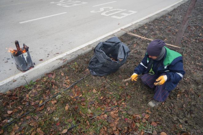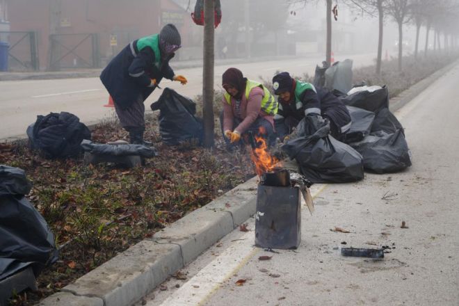 Bolu Belediyesi Park ve Bahçeler Müdürlüğü'ne bağlı olarak çalışan kadınlar, sabahın erken saatlerinde mesaiye başlıyor. Yol kenarlarında ve parklarda güzelleştirme çalışmaları yürüten kadınlar, zorlu hava şartlarına rağmen özveriyle görevlerini yerine getiriyor. Soğuk havada zorlu mesai yapan emekçi kadınlar, teneke içerisinde yaktıkları ateşle ısınma ihtiyaçlarını karşılıyor. Özveriyle çalıştıklarını söyleyen Selma Taşdemir, "Her işi olduğu gibi bizim işin de zorluğu var ama severek yapıyoruz. Isınmak için de ateş yaktık" dedi.