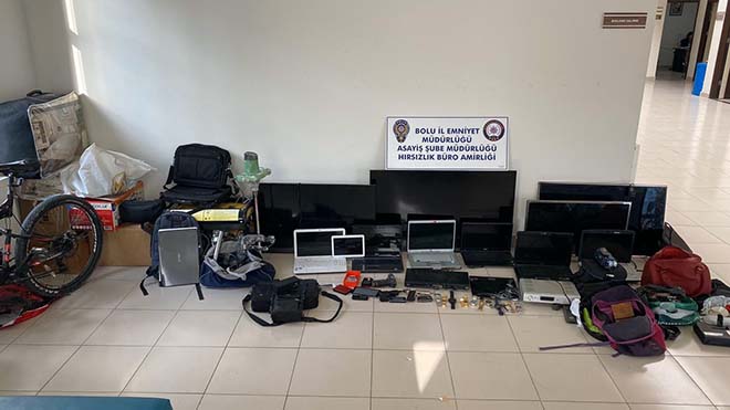 Edinilen bilgiye göre, İl Emniyet Müdürlüğü Asayiş Şube Müdürlüğü ekipleri, Bolu’da son 2 yılda Sağlık, Aşağısoku, Dodurga ve Sarıcalar Mahallelerinde meydana gelen 15 farklı hırsızlık olayıyla ilgili yaptığı çalışmalar kapsamında, şüpheli S.Y.’nin (33) evine operasyon düzenledi. S.Y.’nin evinde yapılan aramalarda çok sayıda laptop, bilgisayar, LCD televizyon, uydu alıcısı, kamera, cep telefonu, saat, bisiklet, DVD oynatıcı ve ziynet eşyası ele geçirildi. Girdiği evlerden çaldığı eşyalarla evini mağazaya çeviren hırsız S.Y. gözaltına alındı. Evde bulunan eşyalar ise sahiplerine teslim edildi.