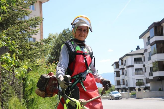 Bolu Belediyesi Park ve Bahçeler Müdürlüğü’nde çalışan 44 yaşındaki Filiz Şahan, 9 yıldır kar, güneş, yağmur, çamur demeden çocuklarını okutmak için çalışıyor. Eşinden boşandıktan sonra maddi sorumluluğu artan 2 çocuk annesi Şahan, şehrin sokaklarını güzelleştirmek için tüm özverisiyle sokak sokak çalışma yapıyor. Ara sokaklarda fazla uzayan çimleri, zararlı otları eline aldığı makine ile biçen fedakar anne, 8.sınıfa giden oğlunu okutmak için ter döküyor. Sabah saatlerinden itibaren işine giden Şahan, mesai bitiminden sonra evindeki işleri tamamlıyor. Şahan, “Bizim işimiz sadece burada bitmiyor, eve gidiyoruz, bir de evde çocuklarla uğraşıyoruz. Yemek, ev işleri zor kadının işi gerçekten çok zor. Bir anne olmak daha bir ağır bir mesuliyet gerektiriyor” dedi.