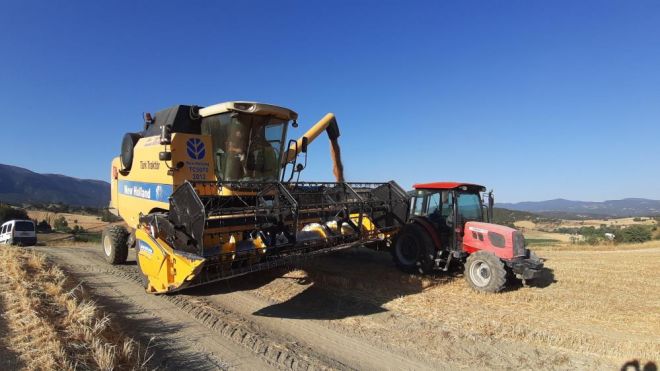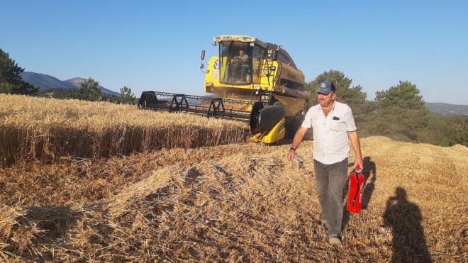Yangın söndürme tüpüyle biçerdöverin yanında yürüyen Cemal Bekil, "Yangınlar çıkmasın diye tankerlerimizle birlikte biçerdöverlerimizin yanında yangına mahal vermemek için hazır bulunmaktayız" dedi.