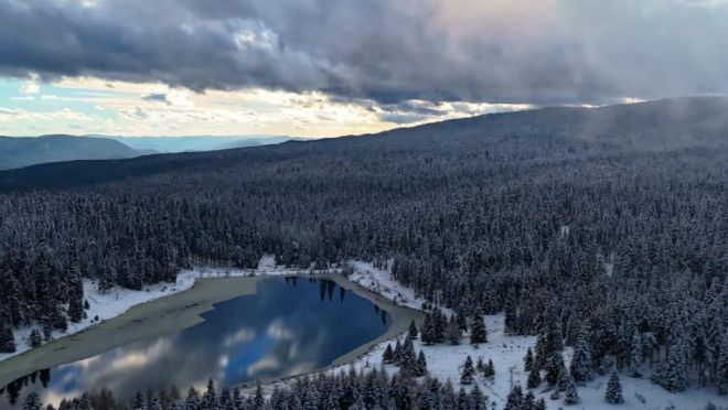 Bolu'da geçtiğimiz hafta yüksek rakımlı mevkilerde kar yağışı etkili oldu. Kar yağışı dolayısıyla Aladağlar, Sarıalan Yaylası, Köroğlu Dağları beyaz örtüyle kaplandı. Karlar içerisinde kalan çam ağaçları gün batımında havadan görüntülendi. Ortaya çıkan görüntülerde çam ağaçlarının üzerindeki karlar ve gün batımı manzarası görenleri mest etti. Gün batımındaki renk cümbüşü, görsel şölen oluşturdu. Hava sıcaklıklarının Aladağlar, Sarıalan Yaylası, Köroğlu Dağları sıfırın altında seyretmesi dolayısıyla bölgedeki karlar yeşil alanlarda durmaya devam ediyor.