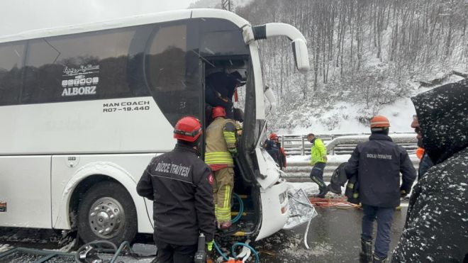 Kaza, TEM Otoyolu’nun Bolu Dağı Tüneli mevkisi Ankara istikametinde meydana geldi. Edinilen bilgiye göre, aniden bastıran kar yağışı sebebiyle sağ ve orta şeritte birçok araç ilerlemekte güçlük çekti. Sol şeritten araçları geçen Baransel Karaca yönetimindeki 06 ESH 719 plakalı tıra, arkasından gelen Nader M. idaresindeki 90AB684 plakalı yolcu otobüsü çarptı. İran’a giden ve içerisinde 28 yolcunun bulunduğu kazada otobüs şoförü araçta sıkışarak yaralandı. Durum 112 Acil Çağrı Merkezi’ne bildirildi. Olay yerine itfaiye, sağlık, Karayolları ve Otoyol Jandarma ekipleri sevk edildi. Araçta sıkışan Nader M., uzun uğraşlar sonucu bulunduğu yerden çıkartıldı. Yaralı sürücü sağlık ekiplerinin ilk müdahalesinin ardından hastaneye kaldırıldı. Kazayla ilgili inceleme başlatıldı.