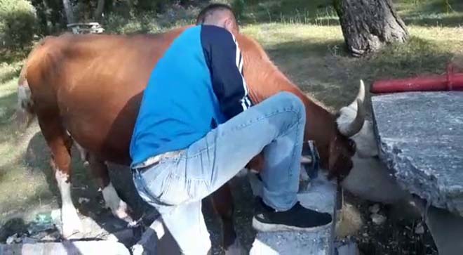 Edinilen bilgiye göre, Mengen’e bağlı Akbuk köyünde bulunan Sıtmapınarı mesire alanında, piknikçilerin bıraktıkları yiyecekleri yemek isteyen Fatih Eroğlu’na ait ineğin kafası beton masa ile oturak arasına sıkıştı. İneğinin kafasını sıkıştığı yerden çıkaramadığını gören Eroğlu, itfaiye ekiplerinden yardım istedi. Olay yerine gelen Mengen Belediyesi itfaiye ekipleri, balyozla beton oturağı kırarak ineğin kafasını sıkıştığı yerden kurtardı.