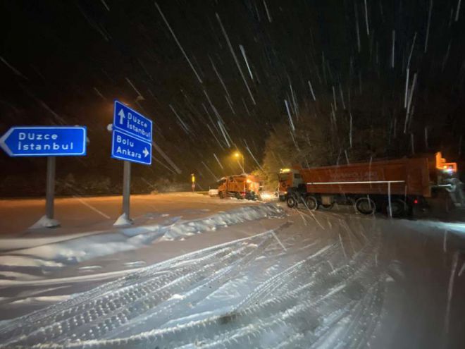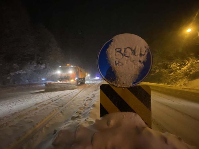 Bolu Dağı’nda yoğun tipi şeklinde etkili olan kar yağışı nedeniyle yol beyaza büründü. Karayolları ekipleri her iki yönde de tek şeritten trafik akışı sağlanması açısından kar küreme ve tuzlama çalışması yapıyor. Yoğun kar yapışı nedeniyle kar kalınlığı dağda 30 santimetreye ulaştı. Korona virüs salgını sebebiyle uygulanan sokağa çıkma kısıtlaması nedeniyle D-100 karayolu Bolu Dağı geçişinde araç yoğunluğu görülmezken, yolda yük taşıyan kamyon ve tırların kalmaması için emniyet ekipleri de Bolu Dağı’nın giriş ve çıkışlarında çalışmalarını sürdürüyor. D-100 karayolu Bolu Dağı Bakacak ve Karanlıkdere mevkisinde yer yer sis nedeniyle görüş mesafesi 10 metreye kadar düştü. Kar yağışının sabah saatlerine kadar etkili olması bekleniyor.
