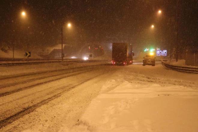 Bolu’da, dün akşam saatlerinde başlayan kar yağışı şiddetini artırarak devam ediyor. Kar yağışı nedeniyle İstanbul’u Anadolu’yu bağlayan D-100 Karayolu ve TEM Otoyolu Bolu Dağı geçişlerinde araçlar güçlükle ilerliyor. Buzlanma ve kar nedeniyle araçlarını yol kenarlarına çeken tır ve kamyon sürücüleri yağışın azalmasını bekliyor. TEM Otoyolu Bolu Dağı kesimi ve D-100 karayolunun Yumrukaya, Abant Kavşağı, Elmalık, Bakacak, Seymenler, Karanlıkdere, Bıçkıyanı, Sarıçökek bölgesinde etkili olan kar nedeniyle meydana gelen trafik kazaları zaman zaman ulaşımı aksatıyor. TEM ve D-100 Karayolu’nun kapanmasına neden olan araçların yoldan kaldırılmasıyla trafik yeniden normale dönüyor. Karayolları ekipleri her iki güzergahta da tuzlama ve kar küreme çalışmalarına aralıksız olarak devam ediyor.