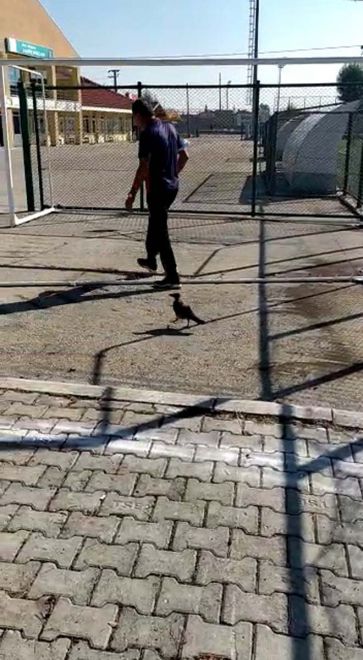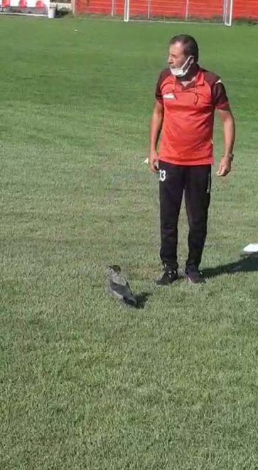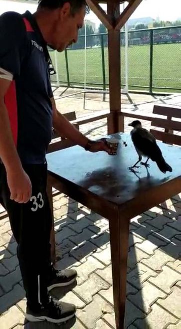 Esmer, kargayı gördüğünde keyif aldığını belirterek, “Burada besliyoruz. Yemek seçmiyor. Ekmek veriyorum. Suyunu içiyor. Bizden çekindiği de yok. Bence tecrübeli bir karga. Gel dediğimde geliyor. Beraber yürüyoruz. Ama buradaki antrenör ve oyunculara da alıştı. Onlar da zaman zaman ekmekle besliyorlar. Antrenmanlarımıza ve Karaçayır’a renk kattı. Burada evcil kedilerimiz var ama o da renk kattı. Onu görünce keyif alıyorum, moralim yükseliyor” dedi.