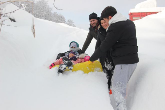 Hafta sonu yoğun kar yağışı olurken ekipler gece gündüz yolu açık tutmak için mücadele etti. Bolu Dağı’nda oturan bir çift ise karın tadını çocukları ile çıkardı. Evden bunalan çift, çocuklarını alarak karda kaydı. Beyaz gelinliğini giyen Bolu Dağı’nda eğlenen aile, yoğun kar yağışının devam edeceğini söyledi. Çocukları ile eğlenen Mecit Kabacı, “4 gündür yoğun bir kar yağışı var. Kar yoğunluğundan dolayı ekipler yolu açmakta zorlanıyorlar. Biz de çocuklarımızla karın cefasını çekeceğimize birlikte sefasına sürmeye karar verdik. Çocuklarla kayak yapacağız, eğleneceğiz. Bu akşamdan itibaren yoğun kar yağışı devam edecek” dedi.