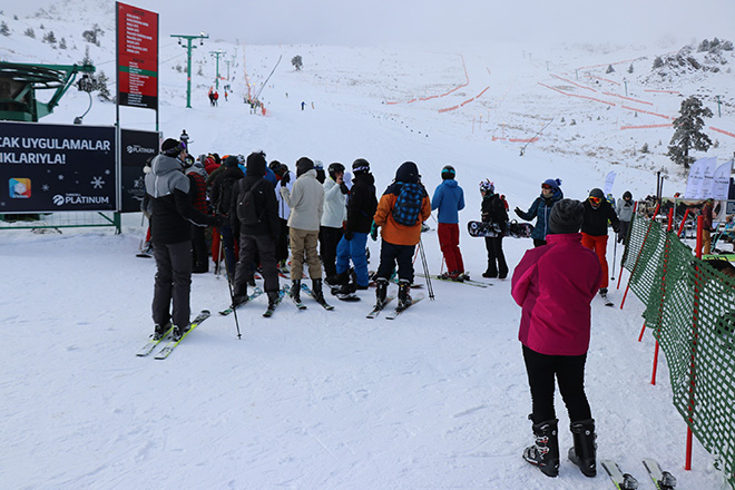 Türkiye’nin en önemli kayak merkezlerinden olan ve Bolu kent merkezine 45 kilometre uzaklıkta bulunan Kartalkaya Kayak Merkezinde kayak sezonu açıldı. Her yıl yerli ve yabancı binlerce tatilcinin tercih ettiği Kartalkaya’da, sezonun açılmasıyla birlikte hafta sonu tatillerini kayak yaparak geçirmek isteyenler yoğunluk oluşturdu. Kar kalınlığının 1 metreyi bulduğu ve 70 kilometre uzunluğundaki 25 pistiyle kayak severlerin en çok tercih ettikleri merkezlerden birisi olan Kartalkaya’ya gelen tatilciler keyifli anlar yaşadılar. Ailesiyle birlikte Beypazarı’ndan hafta sonu tatili için Kartalkaya’ya gelen Adem Çelik, “Kayak sezonu açıldı. Hava güzel. Kar güzel. Kartalkaya güzel. Şu anda 2 pist açık. Her yıl geliyoruz. Kaymak güzel” dedi.