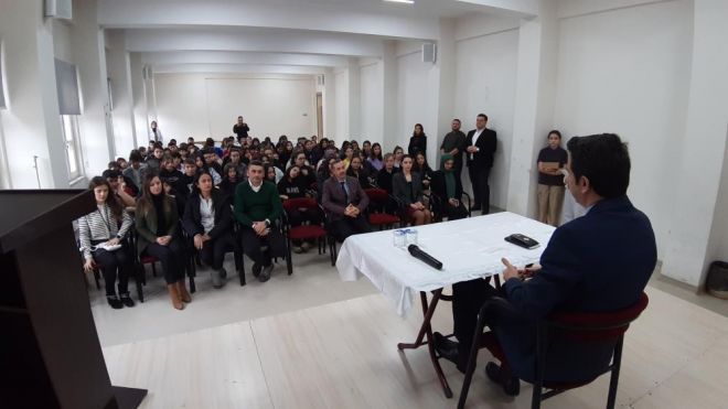 Bolu'nun Mudurnu ilçesinde uzun süredir görev yapan Kaymakam Ayhan Kalaycıoğlu Mudurnu Cumhuriyet Ortaokulu öğrencileri ile ‘Kariyer Buluşmaları' programı kapsamında bir araya geldi. Kaymakam Kalaycıoğlu, konuşmasında kaymakamlık mesleğinin sorumluluklarından, ilçenin mülki amiri olarak kamu kurum ve kuruluşlarını nasıl yönettiğinden bahsetti. Öğrencilerin sorularını içtenlikle yanıtlayan Kaymakam, mesleğin zorluklarını ve avantajlarını anlattı. "Kaymakam olmak için hangi şartlar gerekiyor?", "Kendinize vakit ayırabiliyor musunuz?" gibi sorular yönelten öğrencilerle keyifli bir sohbet gerçekleştirildi. Sohbetin sonunda, öğrenciler Kaymakam'a sevgi gösterisinde bulunarak alkışladı ve bir plaket takdim etti. Kaymakam Kalaycıoğlu, öğretmenlere ve öğrencilere teşekkür etti.