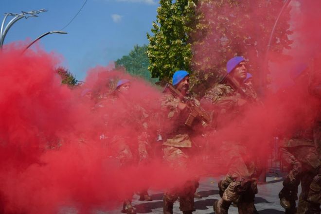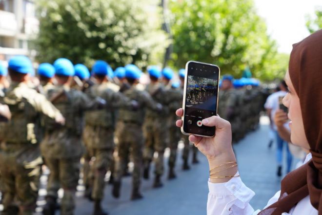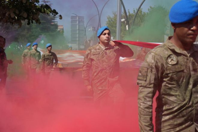 Törende, iç güvenlik harekatlarındaki üstün başarılarından dolayı Türkiye’nin çift sancaklı tek tugayı olan Bolu 2’inci Komando Tugay Komutanlığındaki komandoların geçişi renkli görüntülere sahne oldu. Sis bombaları altında yürüyen mavi bereliler törene katılan vatandaşlar tarafından dakikalarca alkışlandı. Komandoların marşlarla geçişi sırasında vatandaşlar da ellerinde Türk bayraklarıyla askerlere sevgi gösterilerinde bulundu. Mavi berelilerin marşlarla geçişi caddeyi inletti.