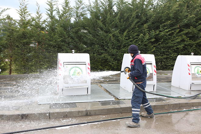 Dünyada hemen hemen her ülkeye sıçrayan ve çok sayıda ölüme yol açan Covid-19 Korona virüs tehlikesinin ülkemizde de görülmesinin ardından Bolu Belediyesi halk sağlığını sağlamak ve salgının önlenmesi için gerekli önlemleri aldı. Bu kapsamda tehlikeli virüse karşı birçok alanda düzenli olarak dezenfekte çalışmalarını sürdüren belediye ekipleri, yer altı çöp konteynerlerini de düzenli olarak dezenfekte ediyor. Ekipler ayrıca belirli aralıklarla sokaklar ve caddelerde de yıkama çalışması gerçekleştiriyor.