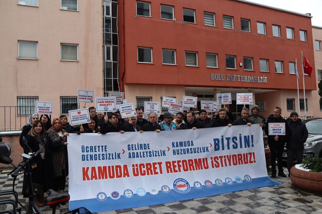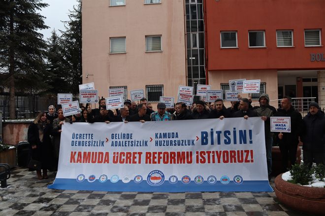 Memur-Sen ve Eğitim-Bir-Sen üyeleri, kamu çalışanları arasındaki ücret dengesizliğine dikkat çekmek amacıyla Türkiye genelinde eşzamanlı basın açıklamaları yaptı.Bolu İl Defterdarlığı önünde gerçekleştirilen basın açıklamasını Memur Sen Bolu İl Temsilcisi Sami Yılmaz okudu. Yılmaz yaptığı açıklamada şu ifadelere yer verdi;
