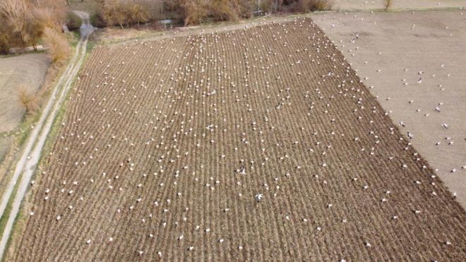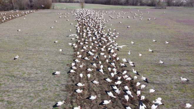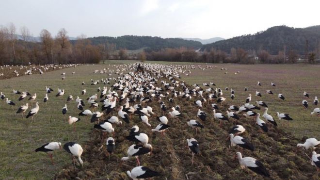 Baharın habercisi leylekler, göç yolculuklarına başladı. Soğuk bölgelerden sıcak bölgelere göç eden yüzlerce leylek, Mudurnu ilçesi Munduşlar köyünde mola verdi. Tarlasını süren bir vatandaşın, 5 dönüm arazisine yüzlerce leylek kondu. İşlenen topraktan çıkan böcek ve tohumları yiyen yüzlerce leylek, 5 dönümlük arazide adım atacak yer bırakmadı. Burada bir süre hem beslenen hem de dinlenen leylekler, daha sonra göçe devam etti.
