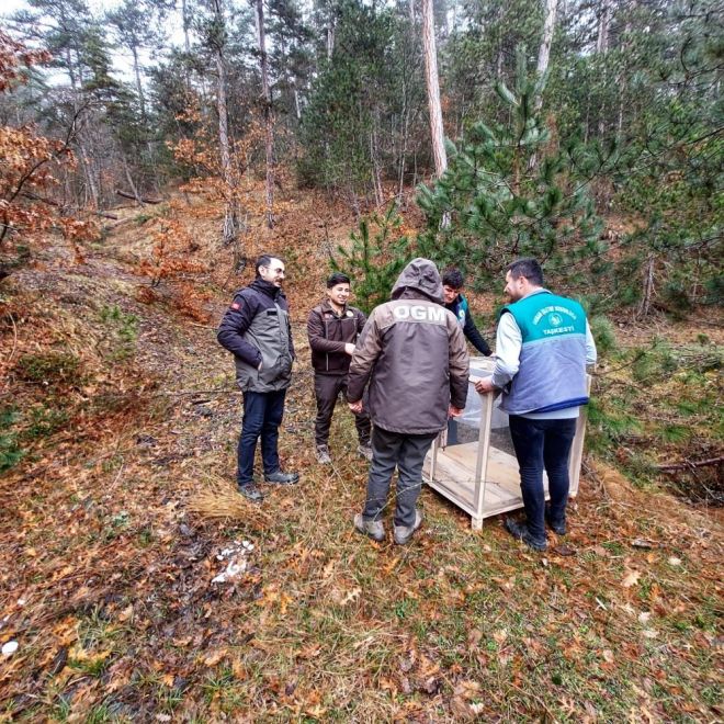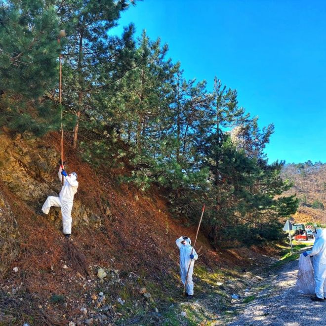 Bilgili, “Taşkesti Orman İşletme Müdürlüğü sorumluluk alanında bulunan çam ağaçlarının yayılış gösterdiği alanlarda çam kese böceği ağırlığı olmuş olup, bu böcek çam ağaçlarının ibrelerini yemek suretiyle ağaçların gelişmesine zarar vermektedir. Bu sahalarda mücadelemizi doğaya yakın olması için biyolojik yani kese böceğinin tırtırlarının bu iş için yapılmış özel makaslarla birlikte budama yapılarak, keselerin yumaklarını alarak, böcek kafeslerine yerleştirip, sonucu buralarda bu kese böceğini doğal yırtıcısı olan diğer böceklerin popülasyonunun arttırılmasına sebep vermekte ve aynı zamanda da diğer kese böceklerinin de popülasyonunun azalmasını meydana getirmektedir. Bu işlemlerimizi yaparken iş sağlığı ve güvenliği hususuna dikkat ediyoruz ve özen gösteriyoruz. Orman köylerimize ve tüm çalışanlarımıza bu işleri yaparken maske, eldiven, tulum ve gözlük kullanmaları gerektiğini belirterek özen ve hassasiyeti gösteriyoruz” diye konuştu.