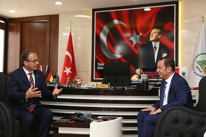 Bolu Belediyesi ile Almanya’nın Neuss şehri arasındaki gönül köprüsü daha da güçleniyor… Bolu Belediyesi’nin dost şehri olan Neuss şehrinin Belediye Başkanı Reiner Breuer ve beraberindeki delegasyon heyet bir dizi ziyaret dahilinde pazartesi günü Bolu’ya geldi. Bolu’da çeşitli temaslarda bulunacak olan Neuss Belediye Başkanı Reiner Breuer ve beraberindeki delegasyon heyeti, ilk olarak Bolu Belediyesi’ni ziyaret etti. Neuss heyeti, burada Bolu Belediye Başkanı Tanju Özcan ve başkan yardımcıları tarafından resmi törenle karşılandı. Zabıta mangasını selamlayan Neuss Belediye Başkanı Reiner Breuer, ardından Belediye Başkanı Tanju Özcan ile birlikte başkanlık makamına çıktı. Bolu Belediye Başkanı Tanju Özcan ve Neuss Belediye Başkanı Reiner Breuer, ziyarete ilişkin basın mensuplarına değerlendirmelerde bulundu.