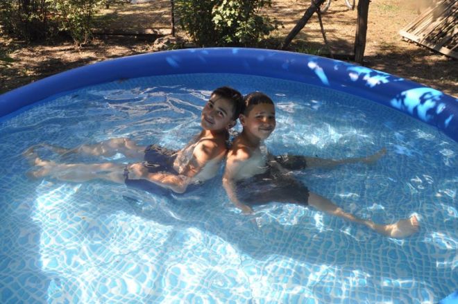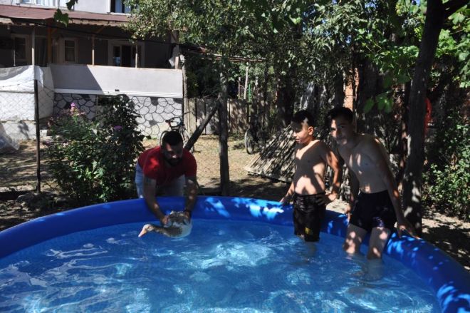 Çocuklar için havuz alan Erkan Sarıkaya, “Bölgemize deniz çok uzak olduğu için ve artık masraf çok olması nedeniyle denizlere gidemiyoruz. Böyle bir şey alıp çocukların eğlenmesini istedim. Evin bahçesine kurduk beş ton su alıyor doldurduk güneş enerjisi ile de ısıttık çocuklar neşeli neşeli eğleniyorlar yüzüyorlar” dedi.