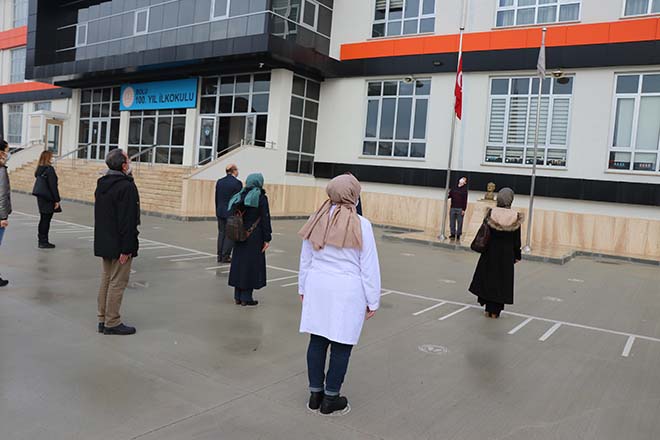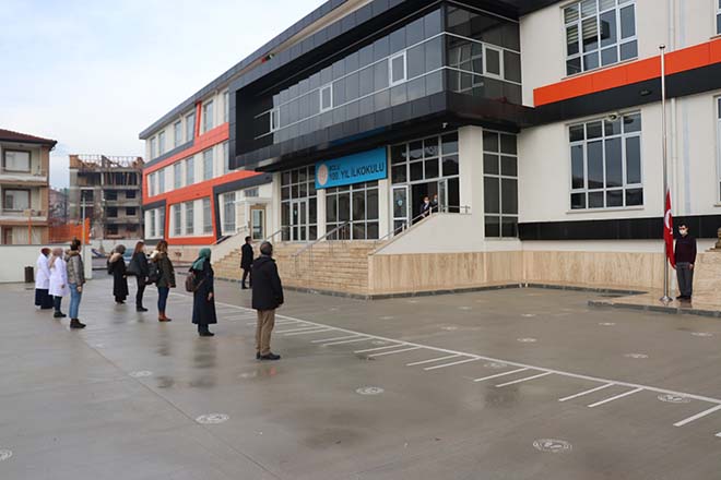 Bolu’da Milli Eğitim Bakanı Ziya Selçuk’un çağrısı üzerine korona virüs salgını sebebiyle yüz yüze eğitime kapalı olan okullarda bayrak töreni düzenlendi. Beşkavaklar Mahallesinde bulunan 100. Yıl İlkokulu bahçesinde düzenlenen bayrak törenine, İl Milli Eğitim Müdürü Cemil Sarıcı, öğretmenler ve okul çalışanları katıldı. Törende aşağı indirilen Türk Bayrağı, İstiklal Marşı ile birlikte göndere çekildi. Korona virüs salgını sebebiyle uzun zamandır okullarından uzak kalan ikiz kardeşler Ceren ve Ceylin Özkan, Türk Bayraklı tişörtlerini giyerek, törene evlerinden eşlik etti. İki kardeş bilgisayar başında katıldıkları bayrak töreninde birlikte İstiklal Marşı’nı okudu.