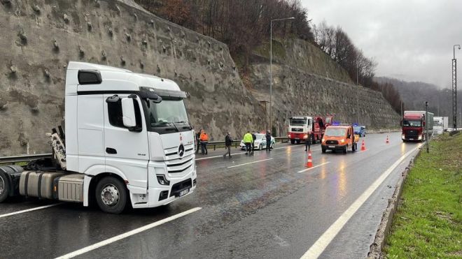 Kaza, Anadolu Otoyolu'nun Bolu Dağı geçişinde İlker Erdem Viyadüğü'nde meydana geldi. Edinilen bilgiye göre, otoyolda İstanbul istikametinde seyreden Uğur Y. yönetimindeki 37 EK 309 plakalı tır, yağmur yağışının etkili olduğu bölgede sürücüsünün direksiyon hakimiyetini kaybetmesiyle kontrolden çıktı. Kontrolden çıkan tırın devrilmemesi için çaba gösteren sürücü sürücü, aracı güçlükle durdurabildi. Tıra bağlı olan çimento yüklü silobas dorse ise devrildi. Anadolu Otoyolu'nun İstanbul istikametinde 2 şerit trafiğe kapandı. Durum 112 Acil Çağrı Merkezi'ne bildirildi. Olay yerine polis ve Karayolları ekipleri sevk edildi. Devrilerek yolu kapatan silobas, polis ekipleri tarafından bölgeye istenen vinç yardımıyla kaldırıldı. Kaza nedeniyle yaklaşık 1 saat trafik tek şeritten kontrollü olarak sağlandı.