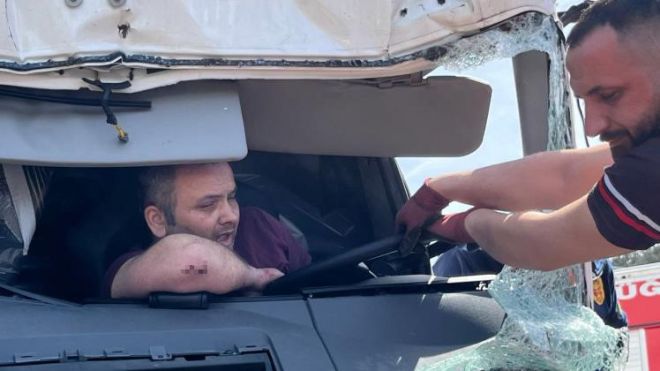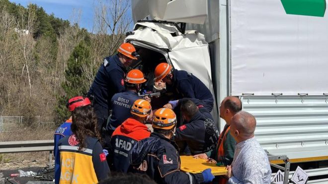 Kaza, Anadolu Otoyolu’nun Bolu geçişinde Çaydurt mevkiinde meydana geldi. Edinilen bilgiye göre, İstanbul istikametinde seyreden Raşit Karataş idaresindeki 27 AON 281 plakalı Volvo marka tırın, sol ön lastiği patladı. Lastiği patlayan tırı sürücü Raşit Karataş, emniyet şeridine park etti. O esnada aynı istikamette seyreden Gökhan Gönül idaresindeki 41 VS 995 plakalı İveco marka kamyon, park halindeki tırın dorsesine çarptı. Çarpmanın etkisiyle tır, otoyolun sol şeridine savrulurken, kamyon kağıt gibi ezildi ve kamyon sürücüsü araç içerisinde sıkıştı. Durumun 112 Acil Çağrı Merkezi’ne bildirilmesi üzerine bölgeye sağlık, polis, jandarma ve itfaiye ekipleri sevk edildi. Olay yerine gelen itfaiye ekiplerinin yaklaşık yarım saatlik çalışması neticesinde araçta sıkışan sürücü bulunduğu yerden çıkarıldı. Tır sürücüsü Raşit Karataş, “Ben tırdan inmiştim. Arkadan gelen araçları diğer şeride yönlendirmeye çalıştım. Ama kamyoncu fark etmedi. Benim ön lastik patlamıştı” dedi. Sağlık ekipleri tarafından olay yerinde ilk müdahalesi yapılan yaralı Gökhan Gönül, hastaneye sevk edildi.Kazayla ilgili soruşturma başlatıldı.