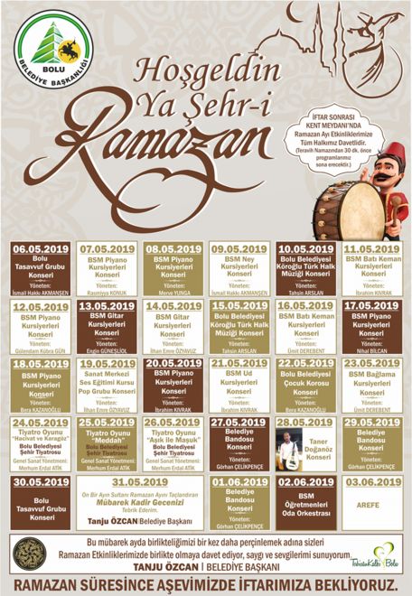 Bolu Belediyesi her yıl olduğu gibi mübarek Ramazan ayında da her akşam iftar sonrası Bolu Kent Meydanı’ndaki etkinlik sahnesinde farklı bir etkinlik düzenleyecek. Kültür ve Sosyal İşler Müdürlüğü’nce düzenlenen etkinliklerde her akşam farklı bir grup sahne alacak. Gerçekleşecek Ramazan etkinlikleri kapsamında; tasavvuf konserleri, Türk Halk Müziği konserleri, piyano, ney, keman, gitar dinletileri ve eski Ramazan’ların olmazsa olmazları arasında yer alan Hacıvat-Karagöz atışmaları gibi gösteriler düzenlenerek, Ramazan ayının dolu dolu geçmesi sağlanacak.