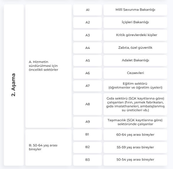 2. aşamada ise A grubunda hizmetin sürdürülmesi için öncelikli sektörler içerisinde yer alan Milli Savunma Bakanlığı çalışanları, İçişleri Bakanlığı çalışanları, kritik görevdeki kişiler, zabıta, özel güvenlik, Adalet Bakanlığı çalışanları, cezaevleri, eğitim sektörü (öğretmenler ve öğretim üyeleri), gıda sektörü (SGK kayıtlarına göre) çalışanları (fırın, yemek fabrikaları, gıda imalathaneleri, ambalajlanmış su üreticileri vb.), taşımacılık (SGK kayıtlarına göre) sektöründe çalışanlar yer alıyor. B grubunda ise öncelik sırasına göre 60-64 yaş arası bireyler, 55-59 yaş arası bireyler, 50-54 yaş arası bireyler yer alıyor.