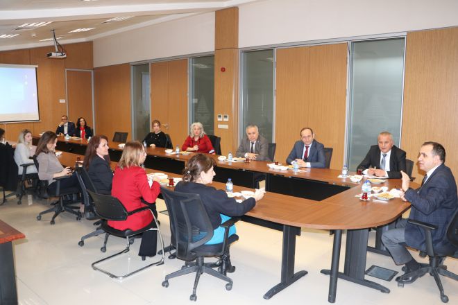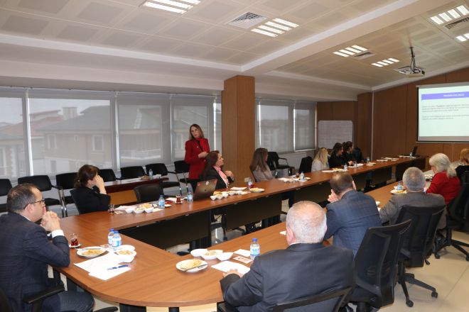Ticaret ve Sanayi Odası Başkanı Türker Ateş’in evsahipliğinde gerçekleştirilen toplantıya BAİBÜ Rektör Yardımcısı Prof.Dr. Sameddin Gündüz, İl Milli Eğitim Müdürü Cemil Sarıcı, Bolu Karma ve Tekstil İhtisas OSB Müdürü Mustafa Gülen, proje sahibi TOBB Kadın Girişimciler Kurulu adına Kurul Başkan Yardımcısı Günseli Özen ve Kurul Üyesi Fatma Aydoğdu ile TOBB Bolu İl Kadın Girişimciler Kurulu Başkanı Emine Yüce ve Kurul üyeleri katıldı. Ticaret ve Sanayi Odası Başkanı Türker Ateş’in Bolu’nun sosyo-ekonomik yapısı ile ilgili sunumuyla başlayan toplantıda, TOBB Kadın Girişimciler Kurulu Başkan Yardımcısı Günseli Özen ve Kurul Üyesi Fatma Aydoğdu tarafından projenin amacı, hedef grupları, proje kapsamında yapılması planlanan çalışma ve faaliyetler hakkında bilgiler verildi. Ayrıca projenin İlimizde etkin işleyişi ve hedef gruplara azami fayda sağlaması adına görüş ve öneriler alınarak istişare edildi.