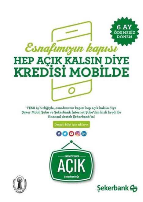 Şekerbank Bolu Şube Müdürü Hilmi TOKMAR ise Pandemi sürecinde esnaf ve sanatkarların nakit ihtiyaçlarını karşılamak için, TESK ile bir protokol yapıldı, esnaf ve sanatkârlarımız 50 bin TL’ye kadar, 36 aya varan vadeli, ilk 6 ayı ödemesiz, 12. taksite kadar düşük miktarda ödeme imkanı sunulan taksitli ticari kredi ürününden faydalanabilecektir” dedi. Şekerbank Bolu Şube Müdürü Hilmi TOMAR” Şekerbank, Kapımız Esnafa açık platformu ile TESK üyesi esnafın yanındadır” diyerek “Şeker Mobil Şube ile kolayca Kredi başvurusu yapabilir, 6 ay ödemesiz dönem ve artan taksitli kredi imkanıyla nakit ihtiyaçlarını esnaflarımız karşılamak için, Şeker Mobil Şube’ye başvurabilirler. Detaylı belgi için https:sekerbank.com.tr/tkts adresini ziyaret edebilirsiniz” diyerek sözlerine son verdi.