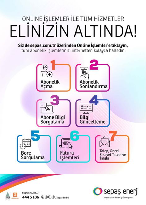 Kocaeli, Sakarya, Bolu ve Düzce’de 1,8 milyon aboneye hizmet veren Sepaş Enerji, müşteri hizmetleri merkezlerinde gerçekleştirilen tüm işlemleri evden çıkmadan kolaylıkla yapabilme imkânı sunuyor. Müşteriler 444 5 186 telefon numaralı çağrı merkezini arayarak veya www.sepas.com.tr adresindeki online işlemler menüsünü kullanarak pek çok hizmetten faydalanabiliyor. Abonelik açma ve sonlandırma, bilgi sorgulama ve güncelleme, fatura sureti görüntüleme, fatura ödeme gibi işlemlerin çağrı merkezi ya da online hizmetler aracılığıyla, günün her saati evden çıkmadan gerçekleştirilebiliyor.