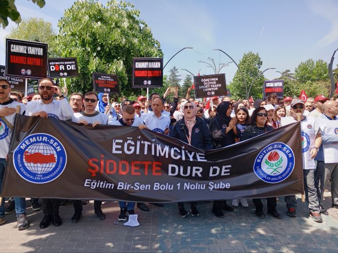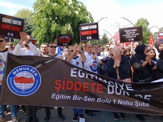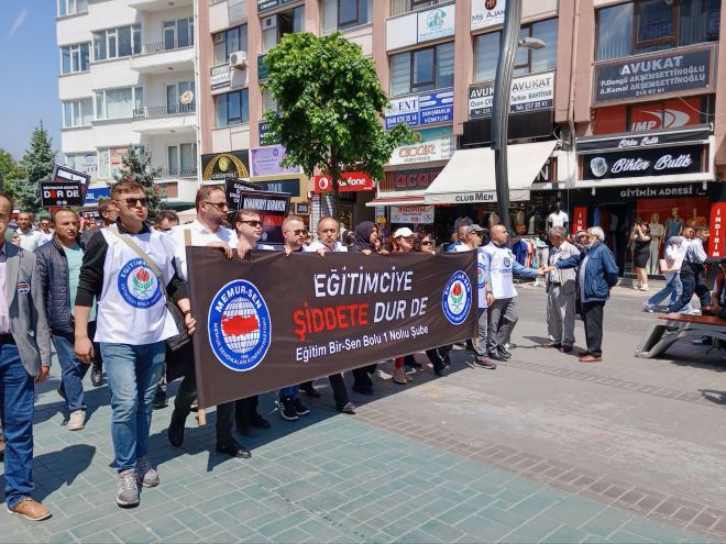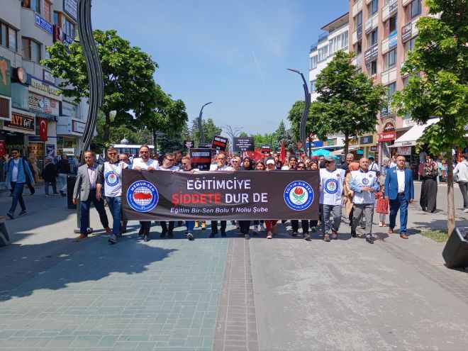 Eğitim Bir Sen Bolu 1 No’lu Şubesi Yönetim Kurulu adına bir basın açıklaması yapan Ahmet Koçak söz konusu açıklamada şu ifadelere yer verdi; “Eğitim çalışanlarına yönelik giderek artan şiddet olaylarını protesto etmek; şiddeti önleyecek, failleri cezalandıracak ve mağdurlara hukuki koruma sağlayacak bir yasal düzenlemenin yapılmasını sağlamak için bir araya gelmiş bulunmaktayız. Son olarak İstanbul/Eyüpsultan’da eski bir öğrenci okul müdürü İbrahim Oktugan’a silahla saldırıda bulunmuş, ağır yaralı olarak hastaneye kaldırılan okul müdürümüz maalesef kurtarılamayarak vefat etmiştir. Meslektaşımıza Allah’tan rahmet, ailesine ve bütün eğitim camiasına başsağlığı diliyoruz. Yıllardır, kanayan bir yara hâline gelen şiddet olaylarına dikkat çekiyor, tedbir alınması için yetkililere çağrıda bulunuyoruz. Bu çağrımızı yıllardır yapıyoruz. Sesimize kulak verilseydi, gereken önlemler zamanında alınmış olsaydı belki de bugün başka şeyler konuşurduk. Ancak ne yazık ki birçok konuda olduğu gibi bu konuda da geç kalınmıştır. Genel Başkanımız Ali Yalçın, Millî Eğitim Bakanı Sayın Yusuf Tekin’in daveti üzerine bakanlıkta bir görüşme gerçekleştirmiş, görüşmenin ardından ortak basın açıklaması yapılmıştır. Sayın bakanın davetini ve eğitimcilere şiddeti önlemek üzere yapılacağı ifade edilen çalışmaları önemli ve kıymetli görüyoruz. Bakanlıkta gerçekleştirilen ortak basın açıklamasının ardından TBMM önünde genel başkanımızın yaptığı geniş katılımlı eylem, eğitimcilere şiddeti önlemeye dönük kararlılığımızın ve şiddet olaylarının oluşturduğu büyük üzüntünün bir tezahürüdür. Dün Ankara’da TBMM önünde yaptığımız çağrıyı bugün burada bizler de yapıyoruz: Artık ölümle sonuçlanmaya başlayan saldırıların son bulması için gereken adımlar ivedilikle atılmalıdır. Eğitimcilere yönelik şiddeti önleme yasası artık çıkarılmalıdır. Öğretmen, memur hizmetli, şef, şube müdürü demeden tüm eğitim çalışanlarına kamu görevlilerine yönelen şiddeti bir defa daha lanetliyoruz. Bugüne kadar kamu görevlilerine gerçekleştirilen tüm şiddet olaylarında tepkimizi en sert şekilde ortaya koyduk. Geçen yıl hayata geçirilen Öğretmenlik Meslek Kanunu tartışmalarında şiddete yönelik düzenlemeyle ilgili sergilediğimiz ısrarın gereği yapılsaydı belki bugün daha farklı konuşmak mümkün olacaktı. Genel Başkanımız Ali Yalçın ile görüşmesinde Sayın Bakanın meslek kanununa ilişkin yeni düzenleme konusunda kullandığı ‘şiddete karşı yasal düzenleme’ ifadelerini son derece kıymetli buluyoruz. Bunun bir an evvel hayata geçmesi yönünde atılan tüm adımların takipçisi olacağız.