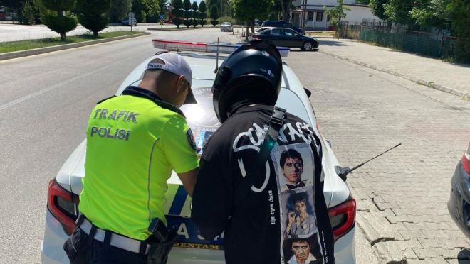 Bolu İl Emniyet Müdürlüğü Trafik Tescil ve Denetleme Şube Müdürlüğünce, trafiği tehlikeye düşüren sürücülere yönelik çalışmalarını sürdürüyor. Sosyal medya hesabında motosikletiyle, trafik polisinden ceza almasına rağmen davranışlarından vazgeçmeyen sürücü, D-100 kara yolu üzerinde tehlikeli sürüşüne devam ederek görüntülerini yeniden sosyal medya hesaplarında yayınladı. Araçlar arasında makas atarak tehlikeli sürüş yapan 14 ADA 873 plakalı motosiklet sürücüsü M.Y., trafik polisinin takibi sonucu Karaçayır Mahallesi'nde yakalandı. Sürücünün ehliyetine "sağlık durumunun yerinde olup olmadığı tespiti" gerekçesiyle el konuldu. Ayrıca yeniden ehliyetini almak için sağlık ocağına başvurması gerektiği öğrenildi. Motosiklet, ehliyeti olan bir yakınına teslim edilirken, M.Y.'ye "tehlikeli araç kullanmak" suçundan toplam 9 bin 267 lira para cezası kesildi.