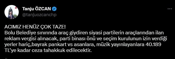 Bolu Belediye Başkanı Tanju Özcan, Bolu Belediyesi sınırlarında araç giydiren siyasi partilerden reklam vergisi alacaklarını açıkladı. Sosyal medya hesabından açıklama yapan Başkan Özcan, seçim kurulunun izin verdiği yerler haricinde bayrak, pankart asanlara ve müzik yayını yapanlara da 40 bin 189 liraya kadar ceza kesileceğini duyurdu. Tanju Özcan, "Bolu Belediye sınırında araç giydiren siyasi partilerin araçlarından ilan reklam vergisi alınacak. Parti binası önü ve seçim kurulunun izin verdiği yerler hariç, bayrak, pankart vs. asanlara, müzik yayınlayanlara 40 bin 189 TL’ye kadar ceza tahakkuk edilecektir" dedi.