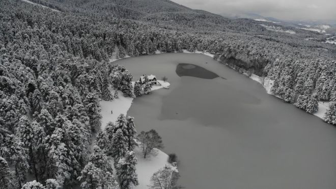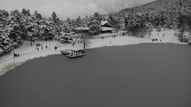 Yılın 4 mevsimi yurtiçi ve yurtdışından binlerce tatilcinin tercih ettiği Gölcük Tabiat Parkı’nın çevresinde bulunan çam ağaçlarının karla kaplı muhteşem manzarası havadan görüntülendi. Hava sıcaklığının sıfırın altında eksi 20 derecelere kadar düşmesi sonrası buz tutan gölün ormanla bütünleştiği görüntüler tatilcileri mest etti.