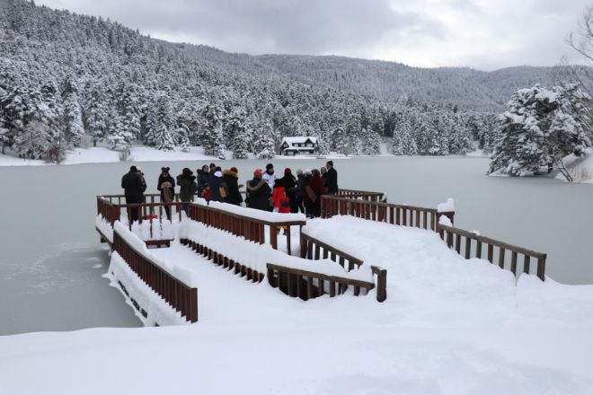 Bolu’nun gözde turizm merkezi olan ve kent merkezine 13 kilometre uzaklıkta bulunan Gölcük Tabiat Parkı, özellikle şehir dışından gelen tatilcilerin akınına uğradı. Hafta sonu kısıtlama nedeniyle tabiat parkına gelemeyen tatilciler yaklaşık 1 metreye yakın kar kalınlığının olduğu eşsiz manzaraya sahip Gölcük’te keyifli anlar yaşadılar. Kar yağışıyla birlikte beyaz örtüyle kaplanan tabiat parkında kartpostallık manzaranın tadını çıkaran tatilciler, donmuş göl çevresinde yürüyüş yaparak ve bol bol fotoğraf çektirerek zaman geçirdiler.