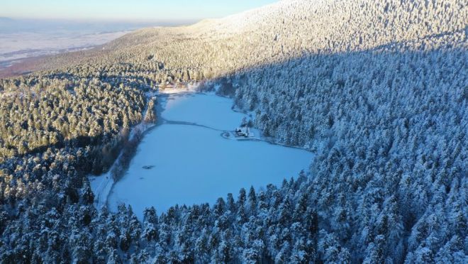 Gölcük Tabiat Parkı, kar yağışının ardından beyaz örtüyle kaplandı. Tatilcilerin yoğun ilgi gösterdiği tabiat parkında kar kalınlığı 50 santimetreyi bulurken, hava sıcaklığının sıfırın altında eksi 32 dereceye kadar inmesiyle park içerisindeki gölün yüzeyi buzla kaplandı. Tabiat parkında donmuş göle girilmemesi konusunda asılan uyarı levhalarına rağmen canlarını hiçe sayan tatilciler, gölün üzerine çıkarak bol bol fotoğraf çektirdi.