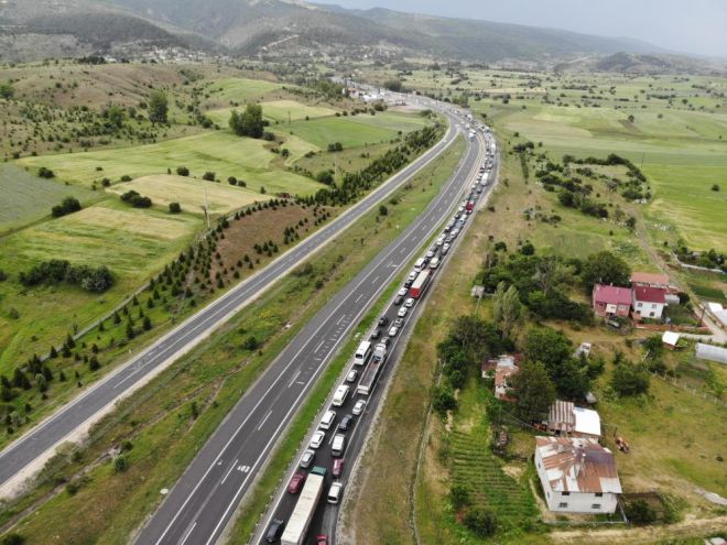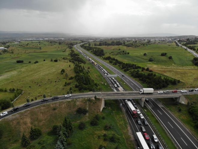 Türkiye’nin en önemli geçiş noktalarından biri olan TEM Otoyolu ve D-100 Karayolu'nun Bolu geçişinde Kurban Bayramı tatili sebebiyle memleketlerine ya da tatil belgelerine gitmek isteyen vatandaşların yoğunluğu sürüyor. Meydana gelen maddi hasarlı kazalar ve araç arızalanmaları nedeniyle trafiğin zaman zaman durma noktasına geldiği Bolu geçişinde, Karayolları ve polis ekipleri olumsuzluklara anında müdahale ediyor. Karadeniz illerine gitmek isteyen sürücülerin kullandığı 2 şeritli Gerede-Karadeniz Bağlantı Yolu’nda uzun araç kuyrukları oluştu. Trafiğin yavaş ilerlediği bölgede uzun araç kuyrukları dronla havadan görüntülendi.