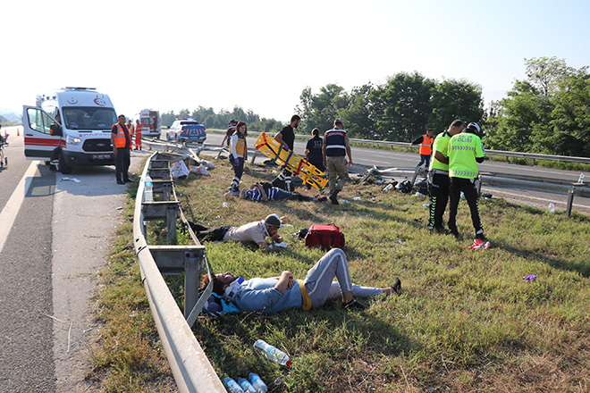 Kaza, saat 08.00 sıralarında TEM Otoyolu Yukarısoku mevki'inde meydana geldi. Edinilen bilgiye göre, Hatay’da katıldıkları cenaze töreninden dönen vatandaşları taşıyan Ali Tunbul idaresindeki 34 LSB 25 plakalı minibüs, kontrolden çıkarak refüje çarptıktan sonra takla attı. Kazada, yola savrulan yolculardan Mehmet Tunbul olay yerinde hayatını kaybederken 10 kişi de yaralandı. Diğer sürücülerin ihbarı üzerine olay yerine çok sayıda 112 sağlık ekibi sevk edildi. Yaralılar olay yerinde yapılan ilk müdahalelerinin ardından kent merkezinde bulunan hastanelere kaldırıldı. Yaralılardan Köroğlu Devlet Hastanesi Acil Servisi’ne götürülerek yoğun bakımda tedavi altına alınan yaralılardan 44 yaşındaki Mehmet Tunbul, tüm müdahalelere rağmen kurtarılamadı.