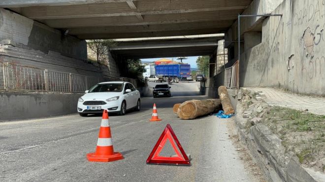 Olay, Kuruçay Mahallesi’nde bulunan alt geçitte meydana geldi. Edinilen bilgiye göre, Galericiler Sitesi istikametinde seyreden B.N. idaresindeki 35 BBA 25 plakalı tomruk yüklü tır, alt geçitten geçmek istedi. Yüksekliği 4.10 metre olan alt geçide, tırın dorsesinde yüklü olan tomruklar takıldı. Tomrukların yola düşmesiyle yol trafiğe kapandı. İhbar üzerine bölgeye polis ekipleri sevk edildi. Yola düşen tomruklar kenara çekildi. Sonrasında tır şoförünün olay yerine yardım için çağırdığı kepçe yardımıyla tomruklar yoldan kaldırıldı. Trafik ekipleri, tır sürücüsüne "yük düşürmek" suçundan cezai işlem uyguladı.