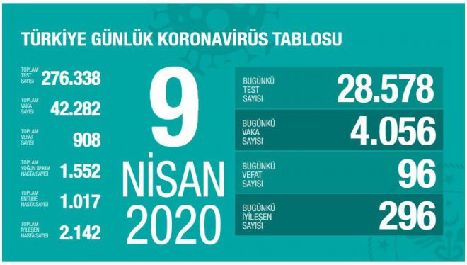 Sağlık Bakanlığı, son 24 saatte korona virüs nedeniyle 96 kişinin hayatını kaybettiğini, toplam can kaybının 908'e olduğunu açıkladı. Açıklamaya göre, bugün 28 bin 578 test yapılırken, 4 bin 56 yeni vaka tespit edildi. Toplam vaka sayısı 42 bin 282 olurken, bugün iyileşen 296 kişi ile birlikte toplam 2 bin 142 kişi iyileşti. Sağlık Bakanı Fahrettin Koca Twitter hesabından yaptığı açıklamada, “Hastalarımızdan 296'sı daha şifa buldu. Taburcu olan toplam hasta sayımız 2 bin 142'ye ulaştı. Günlük 30 bin test hedefimize ulaşmak üzereyiz. Artan test sayımıza rağmen vaka artış hızı düşme eğiliminde. Virüs, gücünü temas ortamından alıyor. Evde kalalım” dedi.