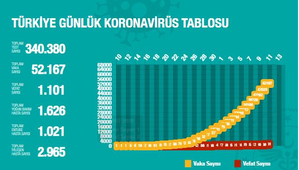 Sağlık Bakanlığı, son 24 saatte korona virüs nedeniyle 95 kişinin hayatını kaybettiğini, toplam can kaybının bin 101 olduğunu açıkladı. Açıklamaya göre bugün 33 bin 170 test yapılırken, 5 bin 138 yeni vaka oldu. Toplam vaka sayısı 52 bin 167'ye yükselirken, bugün iyileşen 542 kişi ile toplam iyileşen sayısı 2 bin 965 oldu. Sağlık Bakanı Fahrettin Koca, Twitter'dan yaptığı açıklamada, “Vaka sayımız, test sayısındaki artışla birlikte, öngörülebilir düzeyde artıyor. Bu artış, yoğun bakım sayısında gerçekleşmiyor. Tanıda daha hızlıyız, tedavi erken başlıyor. Türkiye tedavide ciddi başarı gösteriyor. Asıl başarı virüsten korunabilmekte” dedi.