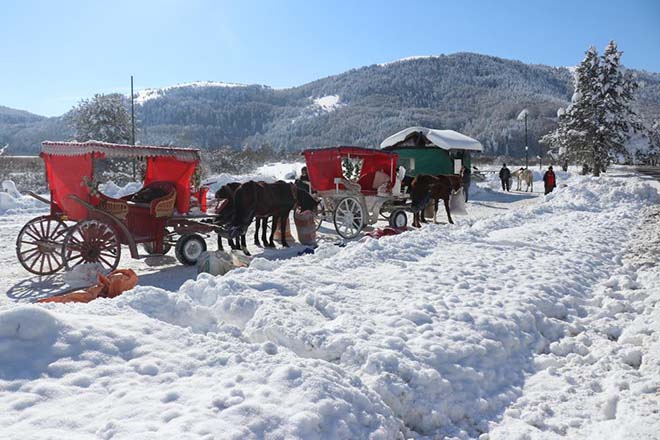 Bolu’nun en önemli turizm merkezlerinden birisi olan Abant Tabiat Parkı’nda 3 gün boyunca süren yoğun kar yağışının ardından kar kalınlığı yarım metreyi geçti. Kent merkezine 42 kilometre mesafede bulunan ve yılın 4 mevsimi yüz binlerce tatilcinin ziyaret ettiği Abant Tabiat Parkı içerisindeki gölün yüzeyi buzla kaplandı. Hava sıcaklığının bu gece sıfırın altında 32 derece ölçülmesiyle Türkiye’nin en soğuk ili olarak kayıtlara geçen Bolu’da, tatil için Abant’ı tercih eden vatandaşlar soğuk havaya rağmen karın tadını çıkardı. Donmuş gölle birlikte bol bol hatıra fotoğrafı çektiren tatilciler, faytonlarla göl çevresinde tur attı.