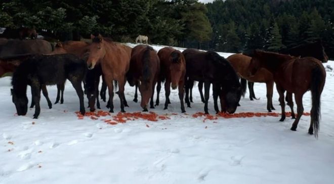 Bolu’nun yılkı atlarıyla meşhur At Yaylası geçtiğimiz hafta etkili olan kar yağışı nedeniyle beyaz örtüyle kaplandı. Kent merkezine 10 kilometre uzaklıkta bulunan bin 150-bin 250 metre rakımda yer alan ve 7 yayladan oluşan At Yaylası’nda yaşayan Bolu’nun meşhur yabani yılkı atları yiyecek bulmakta zorlanıyor. Yılkı atları için doğasever vatandaş Gökhan Bilen, kasalarla yaylaya götürdüğü havuçları atların önüne döktü ve elleriyle de atlara havuç verdi. Bilen’in eliyle atı beslediği anlar sosyal medyada büyük ilgi gördü.