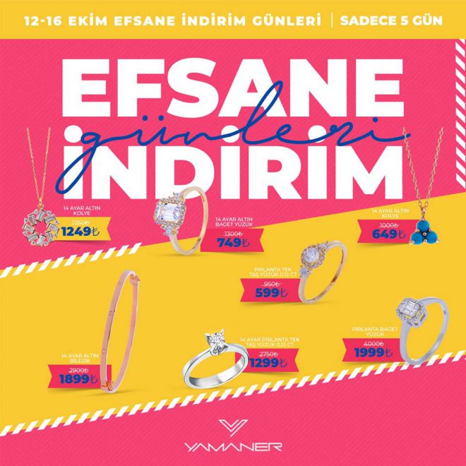Mücevherat ürünlerini lüks olmaktan çıkartarak, en kaliteli ürünleri en uygun fiyata satmayı ilke edinen Yamaner Kuyumculuk’a gelen misafirler “Efsane İndirim” günlerinde, 14 ayar baget pırlanta yüzükleri 1.299 TL’den, özel üretim 14 ayar altın baget yüzükleri ise 599 TL’den başlayan fiyatlar ile alma fırsatını yakalayacaklar.