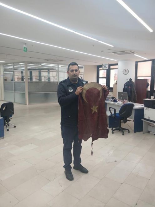 Kepçenin kovasına binerek bayrağı aldığını söyleyen Serkan Güleç, "Bayrak evin ikinci katındaydı. Olduğu yerden çıkardım ve tekrar aşağı inerek yıkımı devam ettirdik. Bayrak bayağı yıpranmış durumdaydı. Eskiden beri belli ki duvarda asılı kalmış. Deforme olmuş. Her ne kadar eski olmuş olsa da gönlüm el vermedi orada enkazın altında kalmasına. Bayrağımızı şu anda zabıta karakolunda saklıyoruz" diye konuştu.