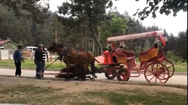Edinilen bilgiye göre, Türkiye’nin önemli turizm merkezlerinden birisi olan Abant Tabiat Parkı’na gelen tatilcileri yılın her mevsiminde göl çevresinde gezdirmek için kullanılan faytonları çeken atlardan birisi aşırı sıcak ve yorgunluk nedeniyle bayıldı. Aniden bayılarak yere düşen at, sahibi tarafından çekiştirilince acı içinde yerden kalkmaya çalışsa da başaramadı. Tatilcilerin gözleri önünde yaşanan olayı bir vatandaş cep telefonuyla görüntüledi.