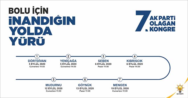 Merkez İlçe ve Gerede İlçe Kongrelerinin tamamlanması sonrası Pandemi nedeniyle ara verilen İlçe Kongrelerinin yeniden başlayacağını belirten İl Başkanı Doğanay; “AK Parti Bolu 7. Olağan Kongre sürecimiz yeni normal şartlara uygun olarak gerçekleştirilecek. 5 Eylül Cumartesi günü Dörtdivan ile başlayacak ilçe kongrelerimiz, 19 Eylül Cumartesi günü Mengen ilçe kongremiz ile sona erecek. Kongrelerimizin şimdiden ilçelerimize, ilimize ve partimize hayırlı olmasını temenni ediyorum. İlçe teşkilatlarımız hamdolsun büyük bir heyecan ve coşku içerisinde kongrelerini gerçekleştirmeyi bekliyordu. Yeni normalleşme süreciyle birlikte maske, sosyal mesafe, temizlik ve hijyen kurallarına azami ölçüde riayet ederek, imkanlar elverdiğince açık alanlarda, büyük bir coşku ve heyecan içerisinde örnek bir kongre sürecini hep birlikte yaşayacağız. AK Parti olarak kongrelerimizi; takım ruhundan taviz vermeden, birlik, beraberlik ve kardeşlik duygusu içerisinde gerçekleştireceğiz inşallah. AK Parti Bolu ailesine ve şehrimize hayırlı olsun” dedi.