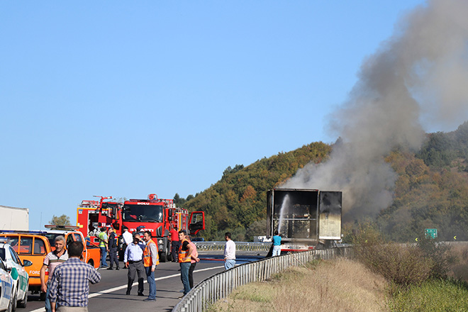 Olay, saat 14.20 sıralarında TEM Otoyolu Köroğlu Park mevkiinde meydana geldi. Edinilen bilgiye göre, Gebze’den Adana’ya elektronik malzeme ve tıbbi ilaç taşıyan Uğur Yıldırım idaresindeki 34 F 6303 plakalı tır, seyir halindeyken yanmaya başladı. Tırın çekici kısmından dumanlar yükseldiğini gören sürücü Yıldırım, aracı emniyet şeridine çekerek aşağı indi. Sürücünün inmesiyle birlikte tır alev alev yandı. Diğer sürücülerin ihbarı üzerine olay yerine Bolu ve Yeniçağa itfaiye ekipleri sevk edildi. Ekiplerin yaklaşık 2 saatlik çalışması sonucu yangın kontrol altına alındı.