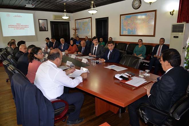 Bolu Valiliği Abant Toplantı Salonu’nda Bolu Valisi Ahmet Ümit başkanlığındaki toplantıya, Bolu Belediye Başkan Yardımcısı İsa Özcan, Cumhuriyet Savcısı İsmail Hakkı Özcan, İl Emniyet Müdür Vekili Tuncay Sancak, İl Jandarma Komutanı Jandarma Albay Ömer Ersever, İl Sağlık Müdürü Muhammet Emin Demirkol ve diğer kurul üyeleri katıldı. İl Jandarma Komutanlığı ve İl Müftülüğü tarafından sunumlar yapılarak ilimizde bağımlılık ile mücadele hakkında yapılan çalışmalar, karşılaşılan sorunlar ve bağımlılıkla mücadele kapsamında bilinçlendirmeye yönelik başlatılan projeler ile yapılacak çalışmalar hakkında kurul üyelerine bilgiler verildi. İl Jandarma Komutanlığı tarafından yapılan sunumda İl Jandarma Komutanı Jandarma Albay Ömer Ersever, bağımlılık ile mücadelede Jandarma Komutanlığının görevleri, ilimizdeki uyuşturucu olaylarının değerlendirilmesi, 2019 yılı içinde meydana gelen olaylar, uyuşturucu madde imali ve ticaretini önlemek amacıyla yürütülen çalışmalar, Jandarma Komutanlığının sorumluluk alanları içinde yer alan okulların çevrelerindeki kontroller ve yapılan işlemler hakkında kurul üyelerine bilgiler verdi. İl Müftülüğü adına İl Müftülüğü Vaizi Durmuş Ateş tarafından yapılan sunumda da, Cami, Kur'an kursları, Aile ve Dini Rehberlik büroları, okullar ve yurtlarda vaaz, hutbe, konferans, seminer gibi yöntemlerle bağımlılıkla mücadele konusunda koruyucu ve önleyici önlemleri içeren eğitim programları hakkında katılımcılara bilgiler aktarıldı. Yapılan sunumların sonrasında kurul üyelerinin kendi fikir ve önerilerini aktarmasının ardından sunumları yapan kurumlara, yapılan çalışma ve projelere emek verenlere teşekkür eden Bolu Valisi Ahmet Ümit, “Bağımlılıkla mücadele herkese yönelik bir mücadeledir. Herkesin kendi üzerine düşen görevi yapmaya çalışmalıdır. Evlatlarımızın kötü alışkanlıklardan uzak durmasını sağlayarak sağlıklı ve bilinçli nesillerin yetiştirilmesinde emeği geçen herkese teşekkürlerimi sunuyorum” dedi.