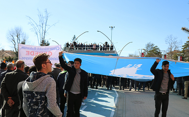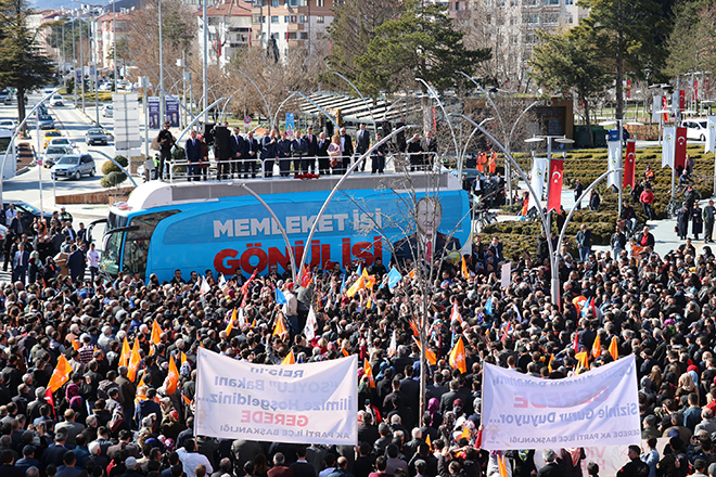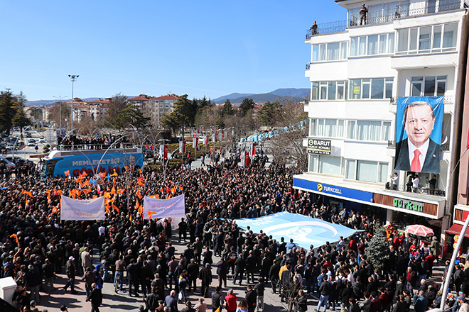 “Yapmak istedikleri 31 Mart’tan sonra bize adım attırmamak, anamızdan emdiğimiz sütü burnumuzdan getirmek. 31 Mart’ta bir zafiyete girersek, şahsi olarak olup olmamamız önemli değil bizden çok var ama bu asil milletten tek var. Onun için dertleşiyorum sizinle. Onun için hangi tuzakla, kumpasla karşı karşıya kaldığımızı size ifade etmek istiyorum. 31 Mart’tan sonra biz zayıflarsak, Güneydoğu ve Doğu’da kaymakam ve valileri 6 yaşındaki çocuğun eline taş vererek maskara haline getirirler. Murat Karayılan’a 13, 14 yaşında onların anasının kucağından alınıp da orada onların masasına meze yapılan, tecavüz edilen kızlarla ilgili tek bir cümle etmediniz. Onlar için Tayyip Erdoğan, Murat Karayılan’dan tehlikelidir. CHP’li kardeşlerime söylüyorum gittiğiniz yol yol değildir, döndürün bu adamı bu yoldan. Bu ülkenin birlik, beraberliğine musallat olan teröristler ile yürümesine engel olun.”