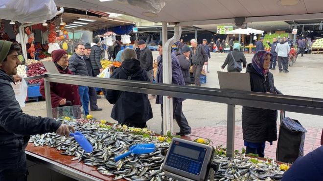 Bolu'nun İhsaniye Mahallesi'nde her pazartesi kurulan pazarda alışveriş yapan vatandaşlar, balık tezgahlarında yoğunluk oluşturdu. Haftalardır etkili olan olumsuz hava şartları ve çeşitli nedenlerden dolayı tezgahlarda hamsi bulunmazken, istavrit, mezgit ve diğer balık çeşitleri vatandaşlardan ilgi gördü. Pazarda 20 yıldır balıkçılık yapan Emre Yıldız, hamsinin Türkiye sınırları içerisine giriş yaptığını vurguladı. Pazar tezgahlarında balık fiyatlarının ise kilogram başına; istavrit 150 lira, mezgit 300 lira, tirsi 200 lira, barbun 500 liradan satışa sunulduğu görüldü. İthal palamudun ise adet başına 250 liradan alıcıyla buluştuğu belirtildi.